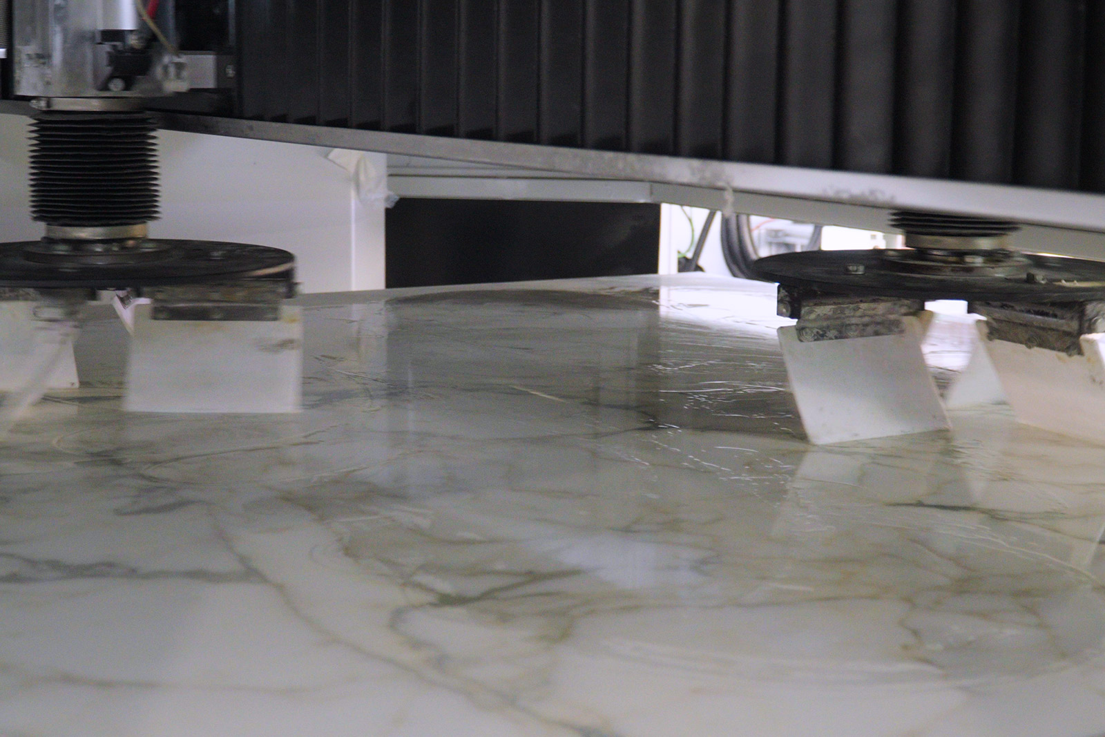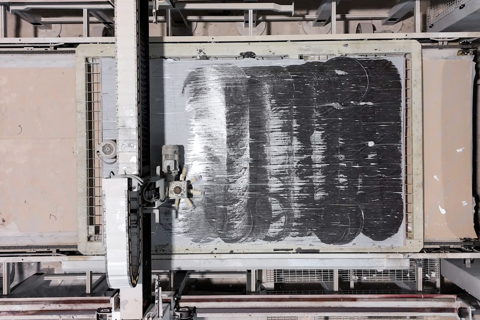 Un carro porta-mandrino, con annessa testa spatolante, si muove trasversalmente alla lastra su un robusto ponte in acciaio per mezzo di guide lineari ROLL-ON protette da soffietti. Il carro è mosso da un sistema motoriduttore e cinghia. A sua volta il ponte si muove, longitudinalmente alla lastra, su guide lineari. Un analogo sistema motoriduttore, cinghia ed asse di sincronismo muove il ponte. L’intera macchina è dotata di un sistema di aspirazione indipendente che evita la dispersione nell’ambiente dei fumi prodotti dall’applicazione di miscele epossidiche su lastre precedentemente essiccate e riscaldate. La macchina è controllata da un PLC industriale installato nel quadro elettrico. Un lettore di profilo lastra permette di controllare automaticamente il movimento del mandrino.