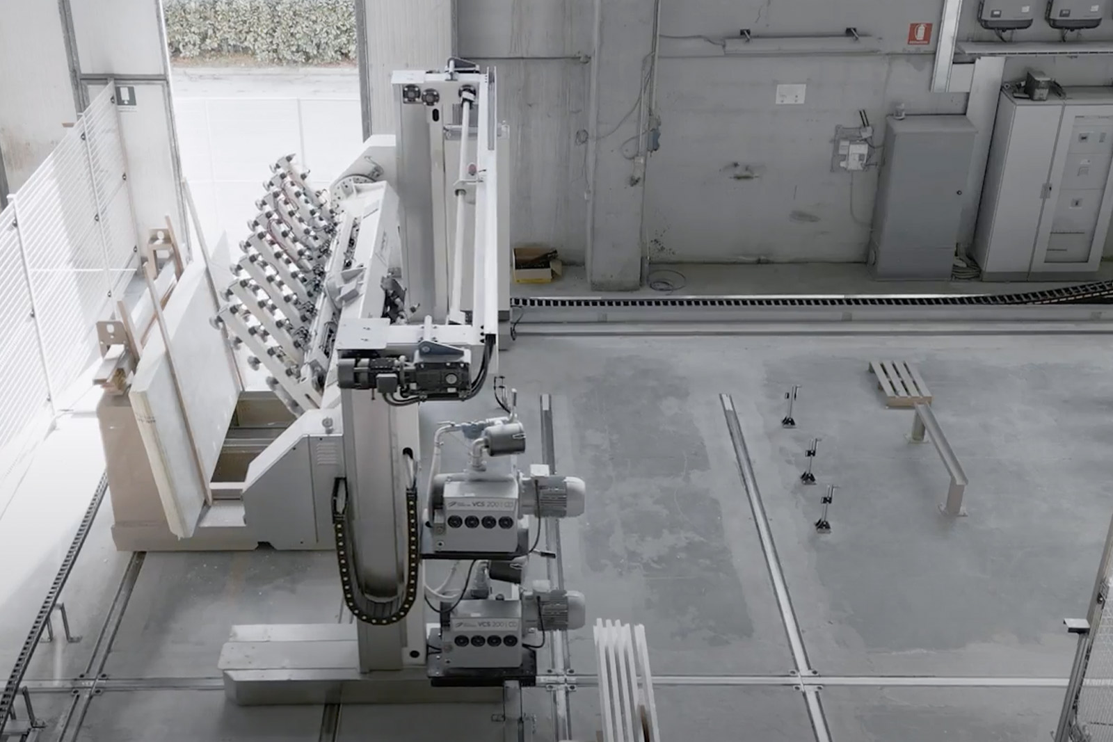 By using this robot on resin lines it is possible the direct loading of the slabs onto the trays. This option is extremely important in case of fragile or fractured material.